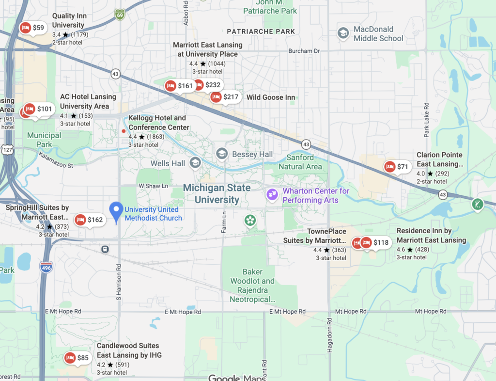 Kellogg Hotel and Conference Center (the closest, must book on their website) https://kelloggcenter.com/